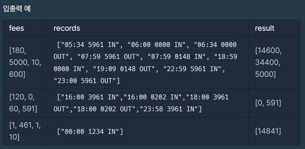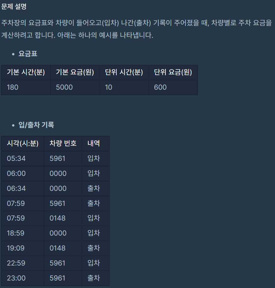 오늘은 KAKAO BLIND RECRUITMENT에 코팅 테스트 문제로 나온 주차요금 계산 문제 풀이를 해보도록 하겠습니다.