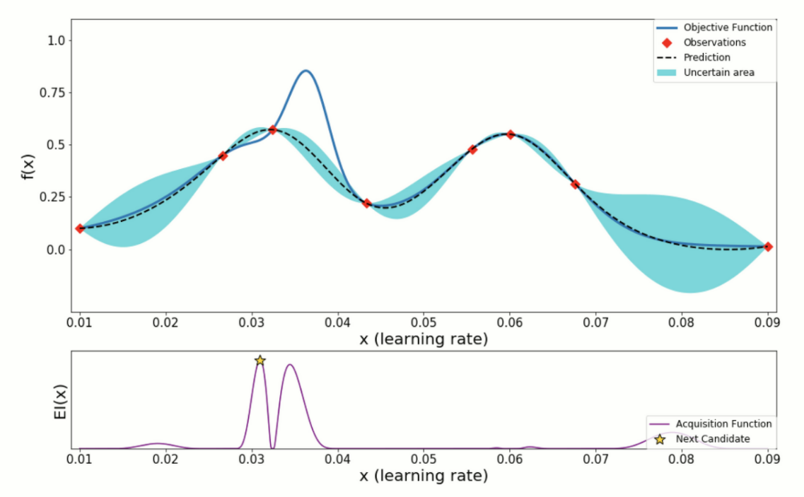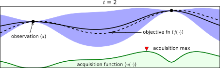 목적 함수에 대한 현재까지의 추정 결과를 바탕으로 가장 최적한 입력값을 찾기 위해 사용할 만한 다음 입력값을 추천하는 함수를 의미합니다. 초록색 부분이 Acquistion Function이며, Dectision을 담당하는 부분입니다.