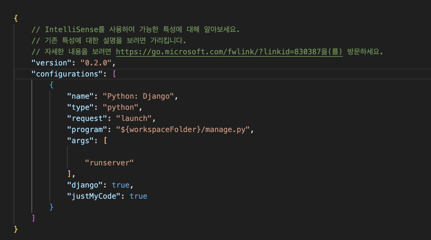 json파일을 확인해보면 디버깅을 위한 경로가 workspaceFolder/manage.py로 설정되어있습니다.