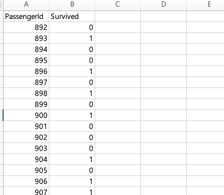 test.csv의 데이터의 사람이 생존했는지 여부를 모델을 통해 결과가 나온 것을 확인할 수 있습니다.