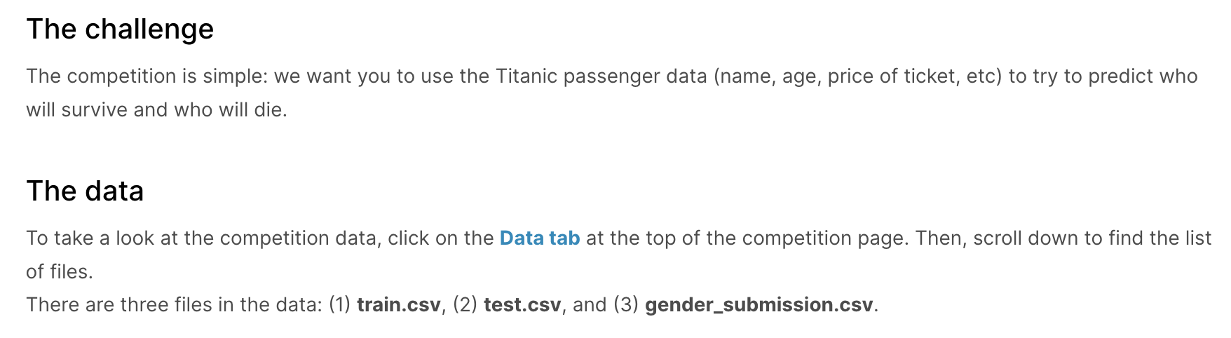 데이터는 train.csv, test.csv, gender_submission.csv 3가지를 사용하게됩니다.