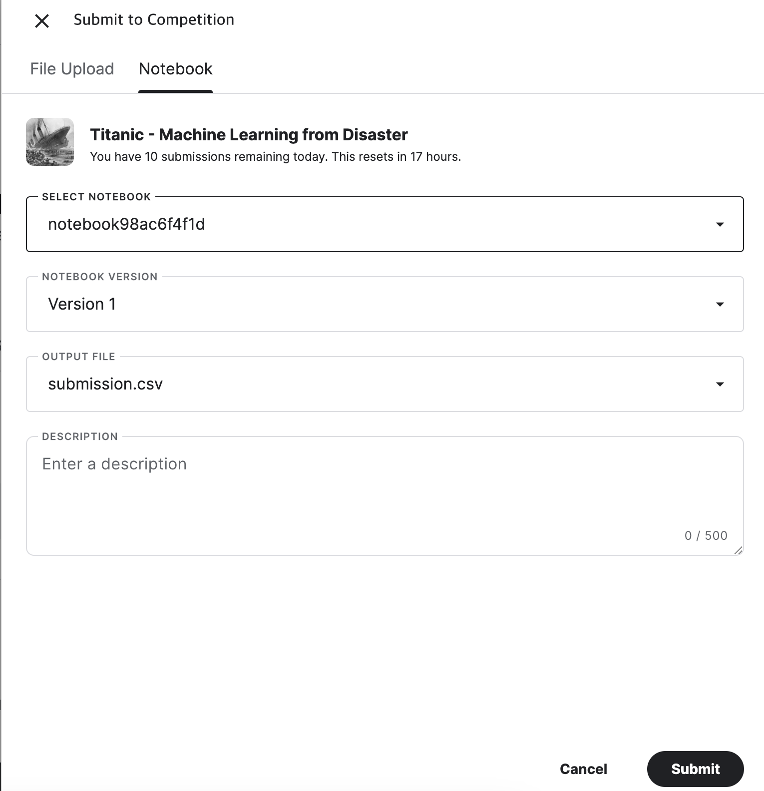 기존 타이타닉 항목에 submit Prediction을 클릭하시고