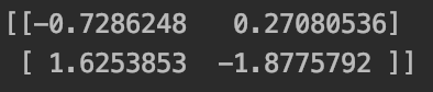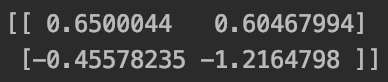 결과 값을 보면 -2부터 2까지의 숫자 중, 랜덤 값으로 (2,2) 행렬에 값이 채워진것을 확인할 수 있습니다.