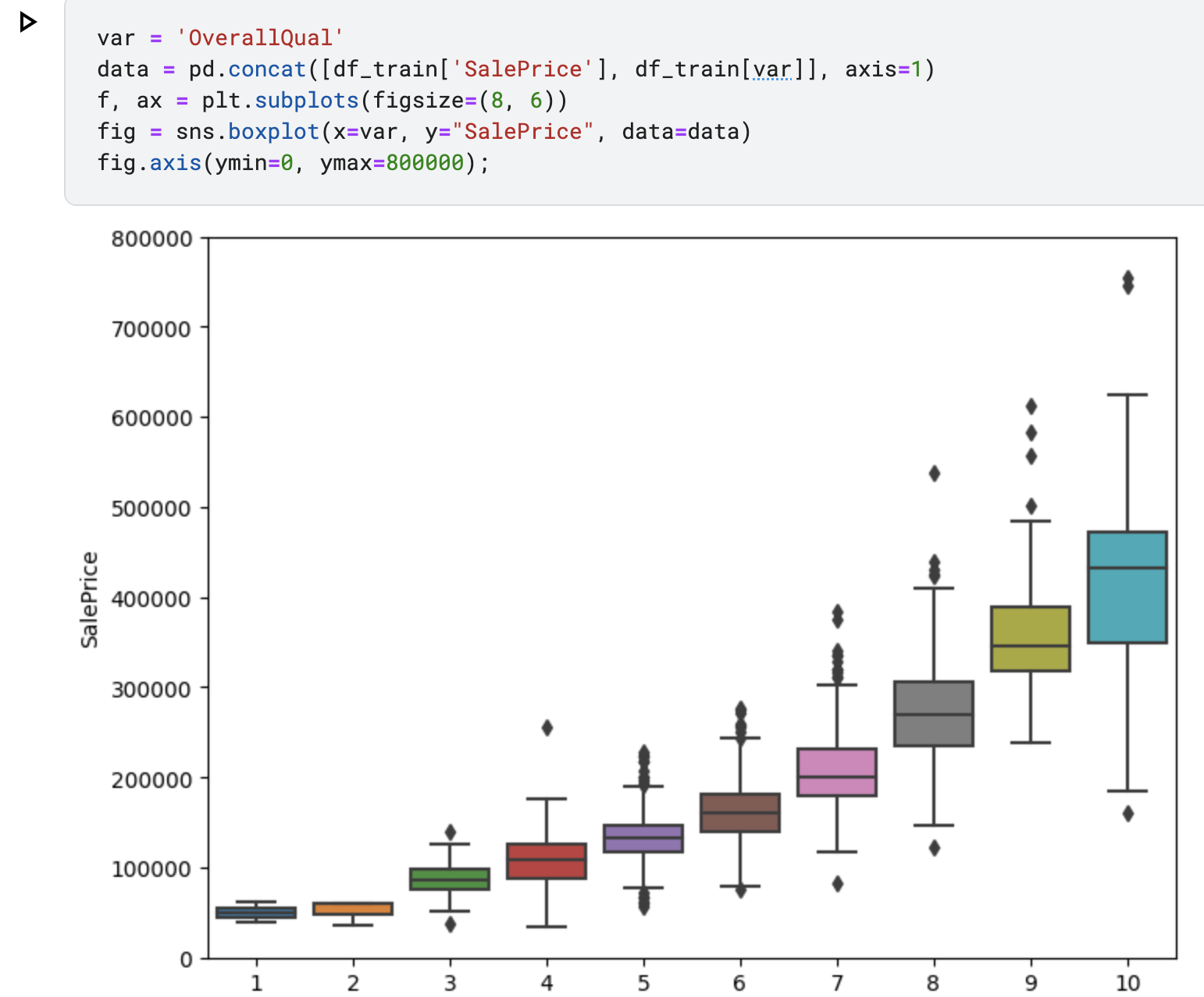 pd의 concat함수로 SalePrice와 OverallQual의 데이터를 합치고