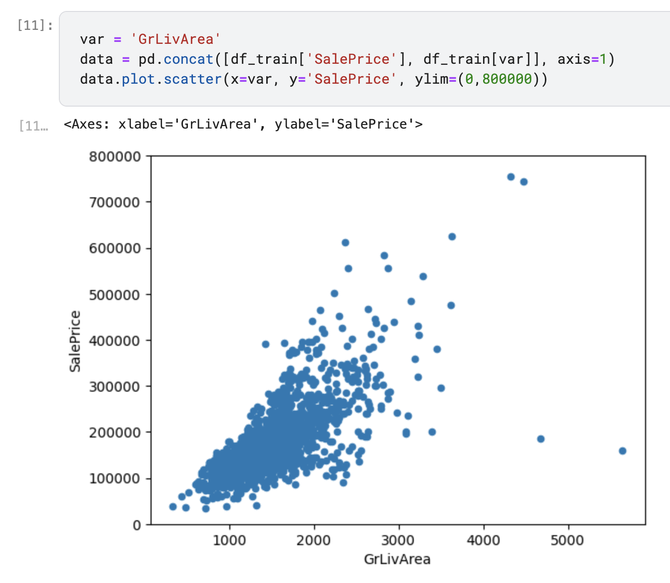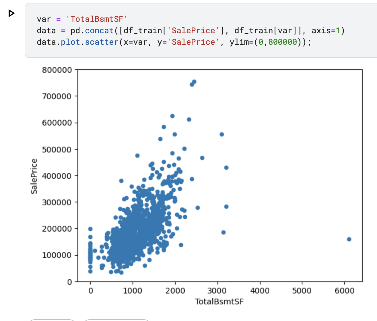 - GriLivArea와 TotalBsmtSF는 SalePrice와 선형관계인 것을 확인할 수 있습니다. 모두 양의 관계를 나타내며, 한 변수가 증가할수록 다른 변수도 증가하는 모습을 보입니다.TotalBsmtSF는 조금 더 기울기가 높아지는 것을 확인할 수 있습니다.