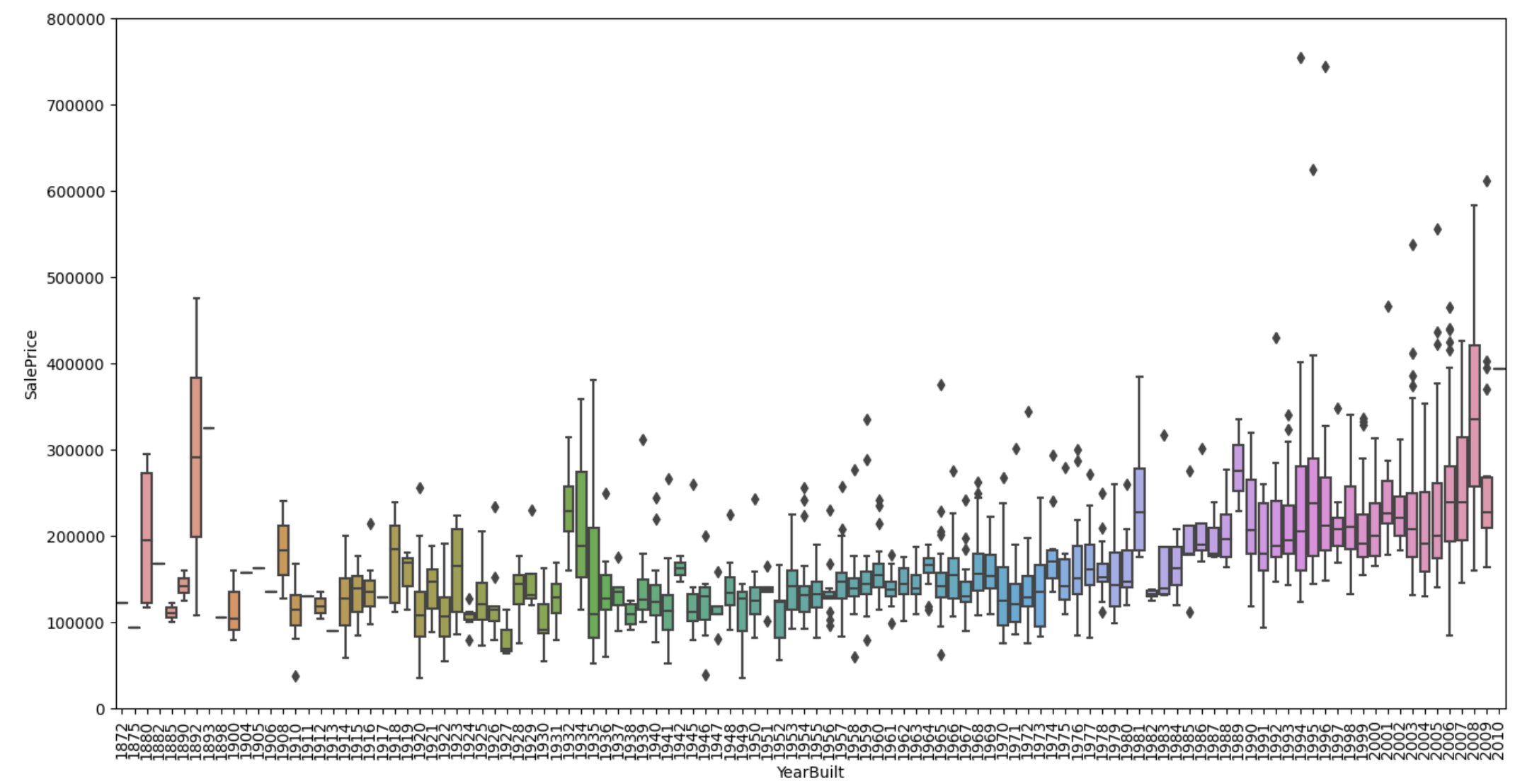 - OveraQual와 YearBuilt도 SalePrice와 연관성을 보입니다. box plot을 통해서 품질에 따른 상승도를 보여주었습니다.