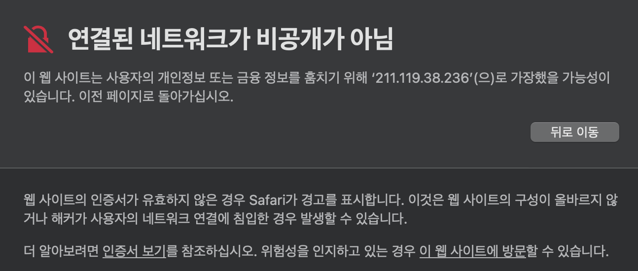 사이트에 접속해보면 사설 SSL인증서를 사용했기에 아래 처럼 발생할 겁니다.