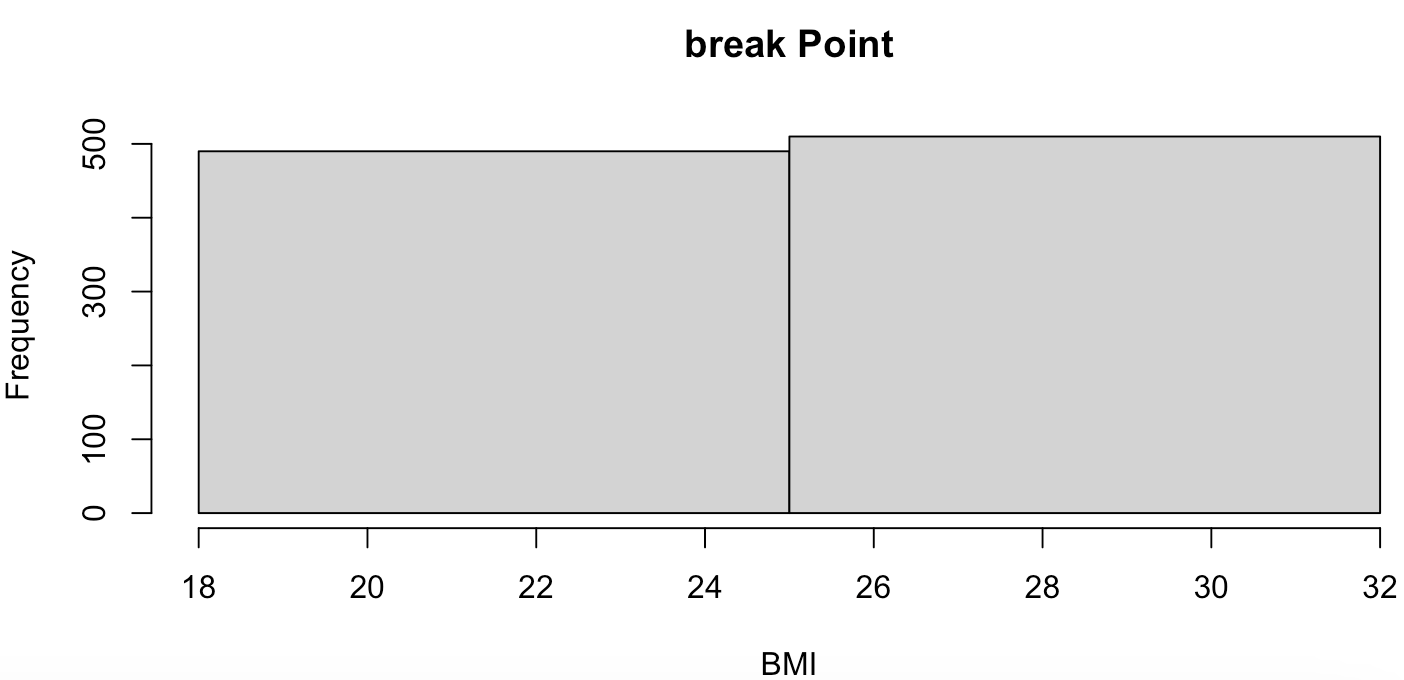 hist(BMI, breaks=c(18,25,32), main='break Point')