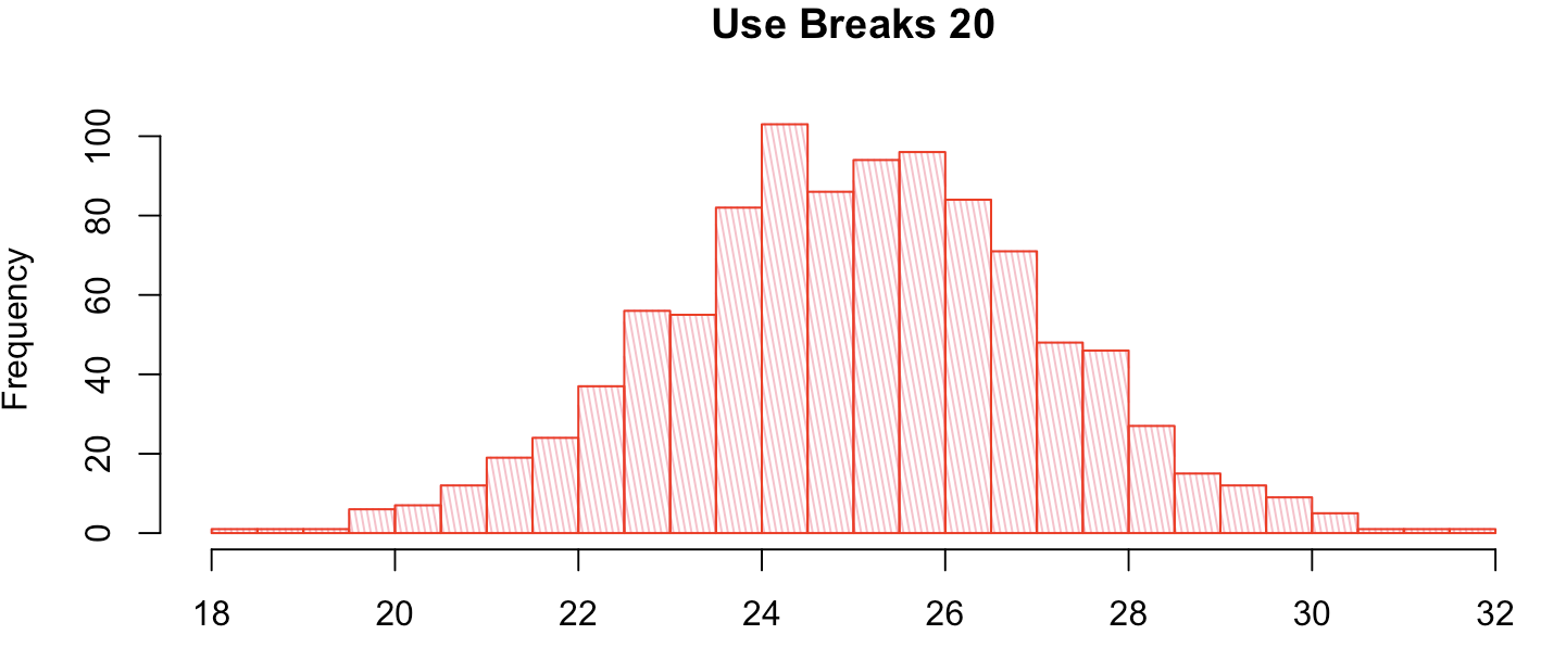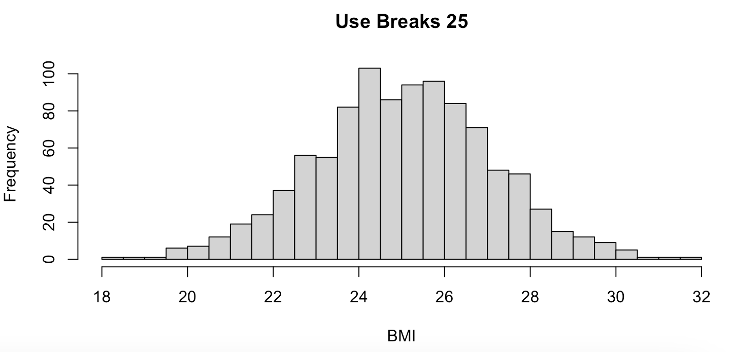 hist(BMI, breaks=25, main = "Use Breaks 25")