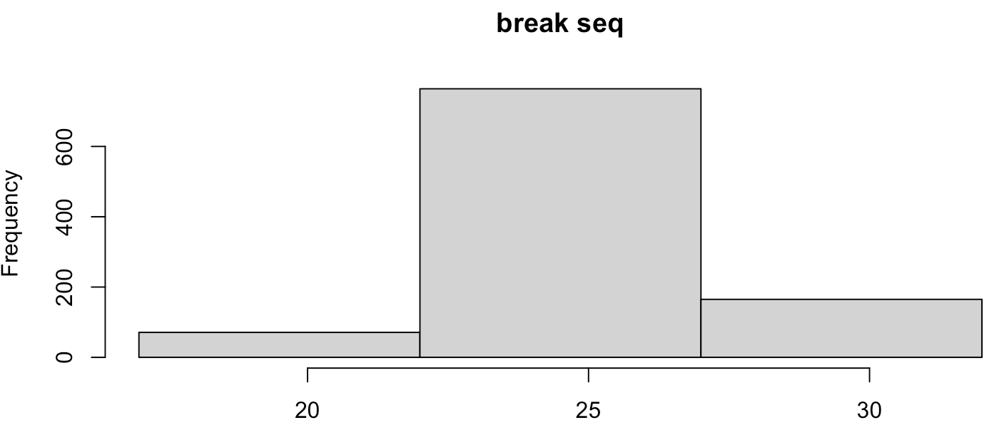 hist(BMI, breaks=seq(17,32, by=5), main='break seq')