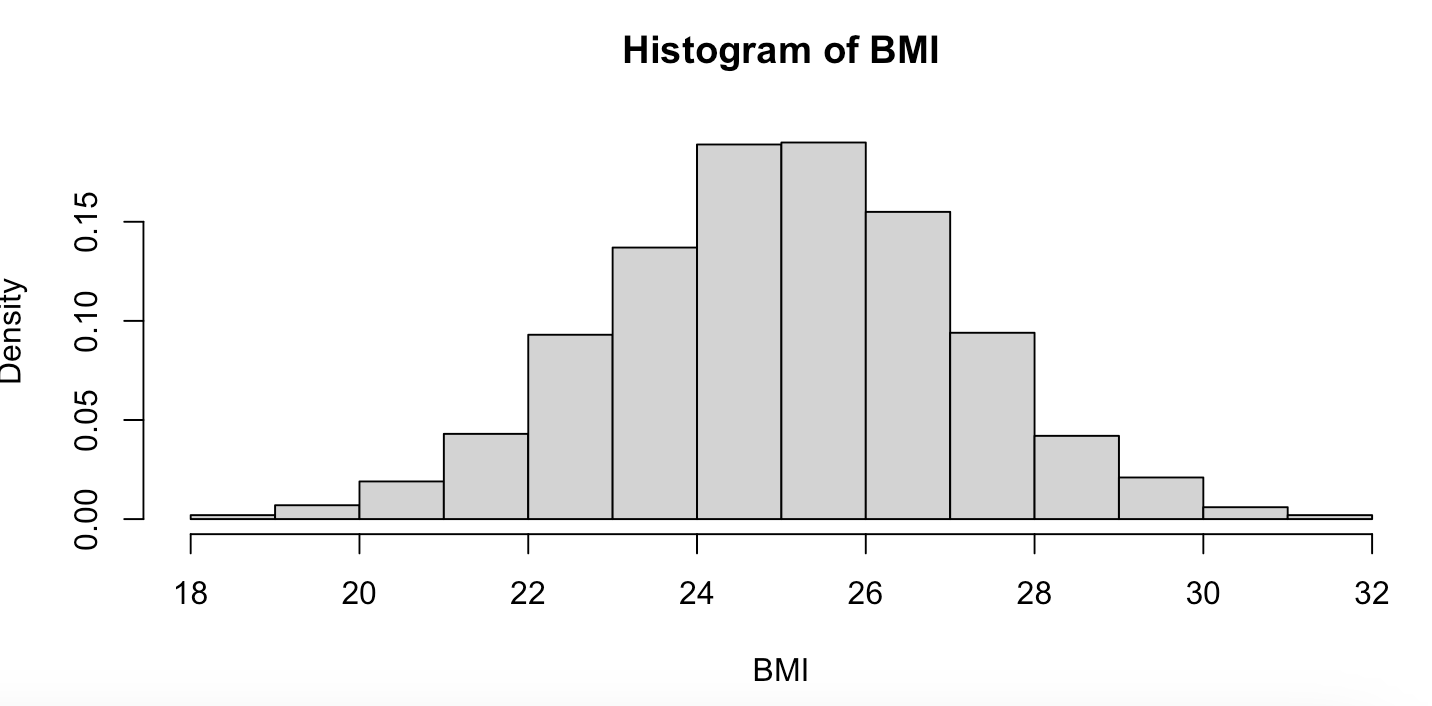 BMI <- rnorm(n=1000, m = 25, sd =2)
