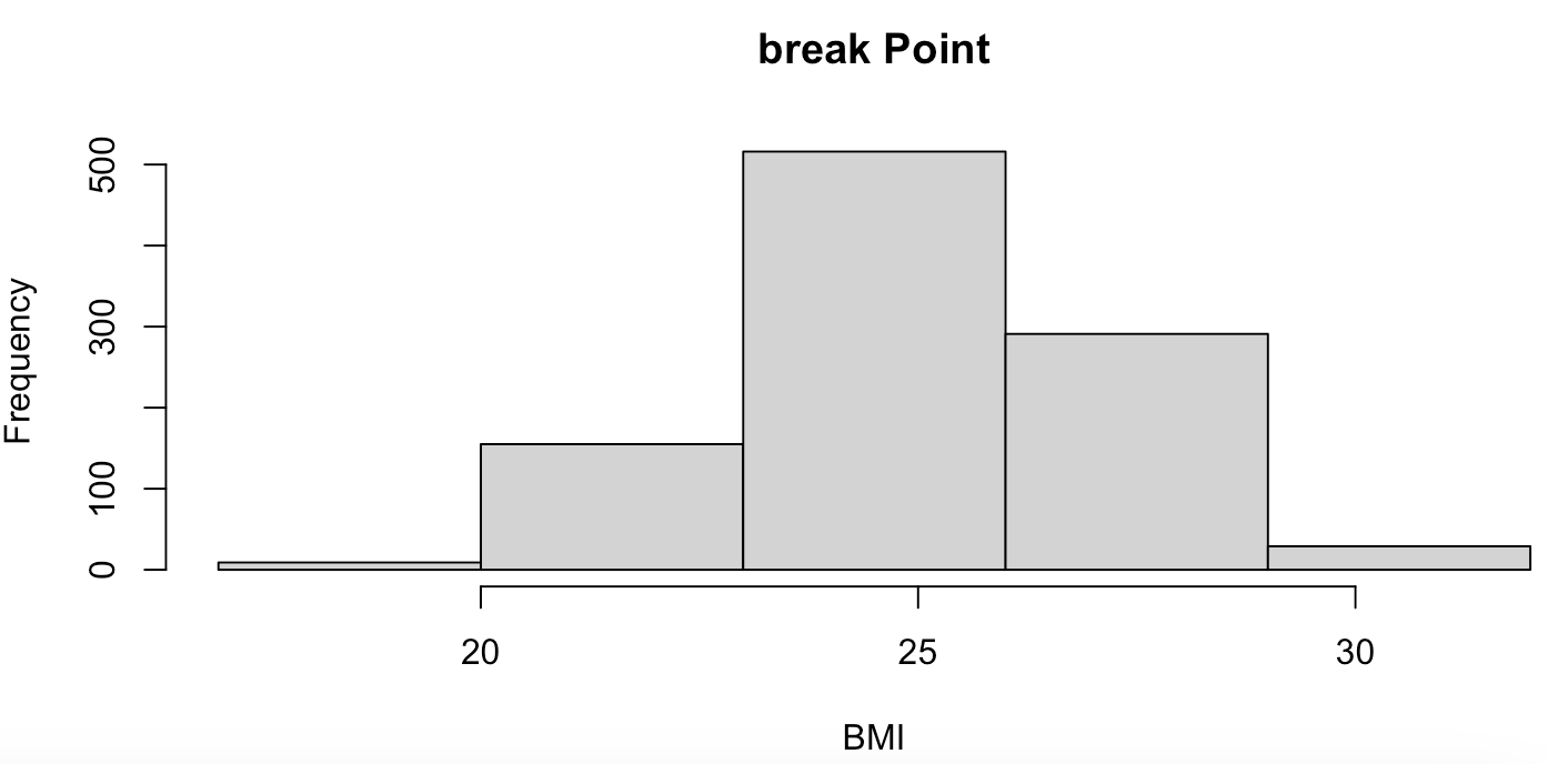 hist(BMI, breaks=c(17,20,23,26,29,32), main='break Point')