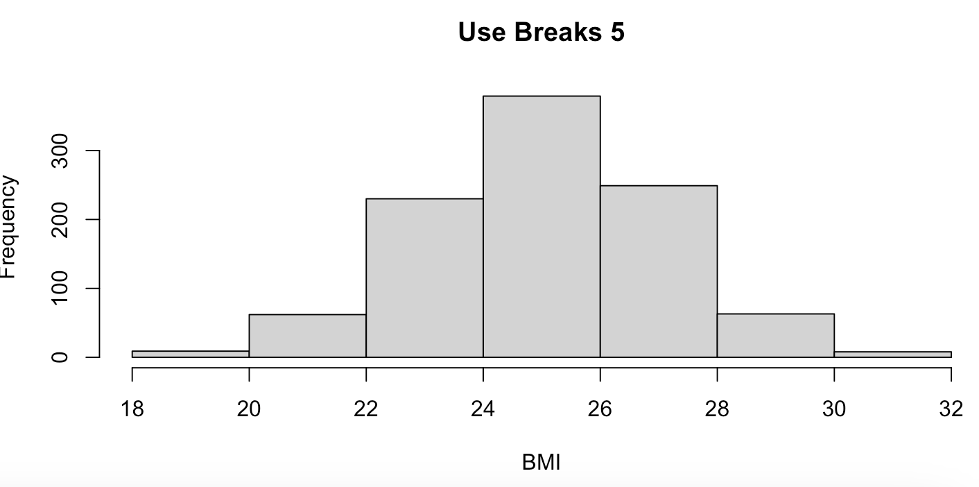 hist(BMI, breaks=5, main = "Use Breaks 5")