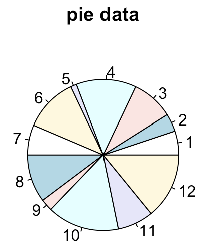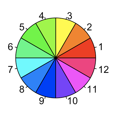 pie(rep(1,12), col = rainbow(12), radius=0.7)