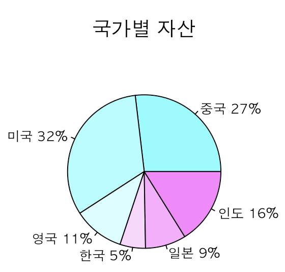 pie(A,labels = B, col=cm.colors(length(B)), main="국가별 자산",cex=0.8)