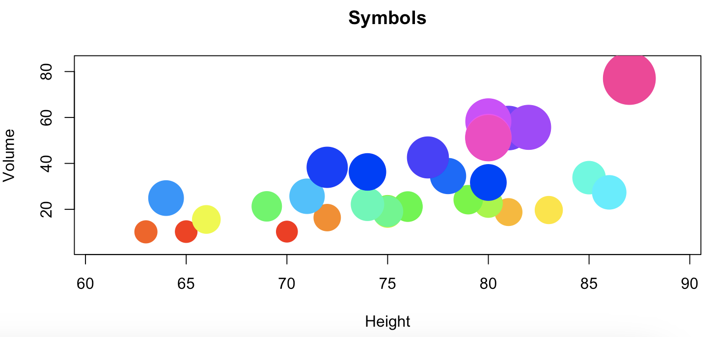with(trees,{ symbols(Height, Volume, circles = Girth/13, inches=F, bg=1:N, fg =1:N, main="Symbols")})