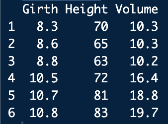 Girth(지름), Height(높이), Volume(볼륨)의 항목의 데이터를 확인할 수 있습니다.