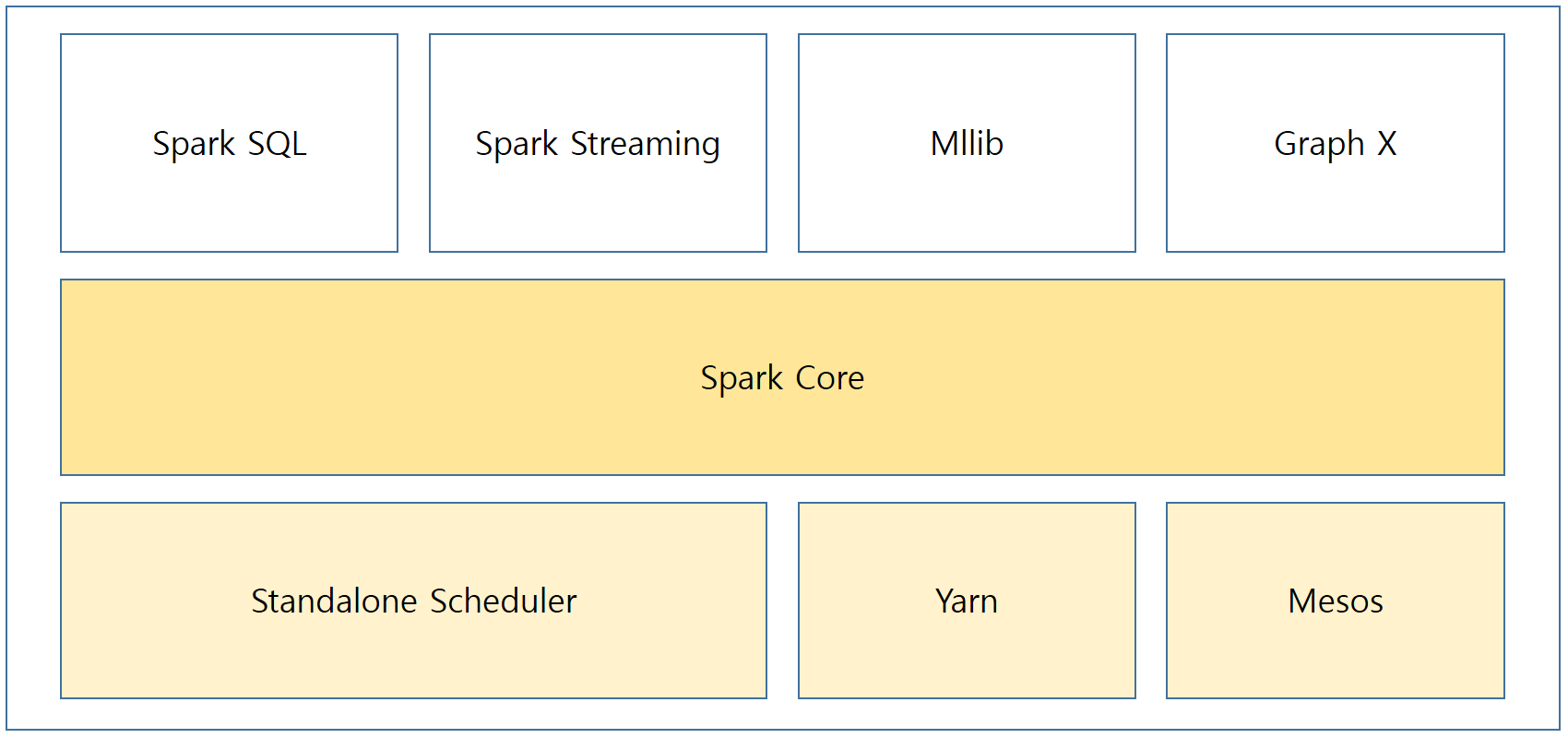 ◆ 작업 스케줄링, 장애 복구, 메모리 관리 등 기본적인 기능을 구성하고 있으며, 탄력적인 분산 데이터 셋(RDD)을 정의하는 API 기반이 된다. 여기서 RDD는 Spark의 아주 중요한 역할을 하는 부분이라 다음에 자세히 알아보도록 하겠습니다.