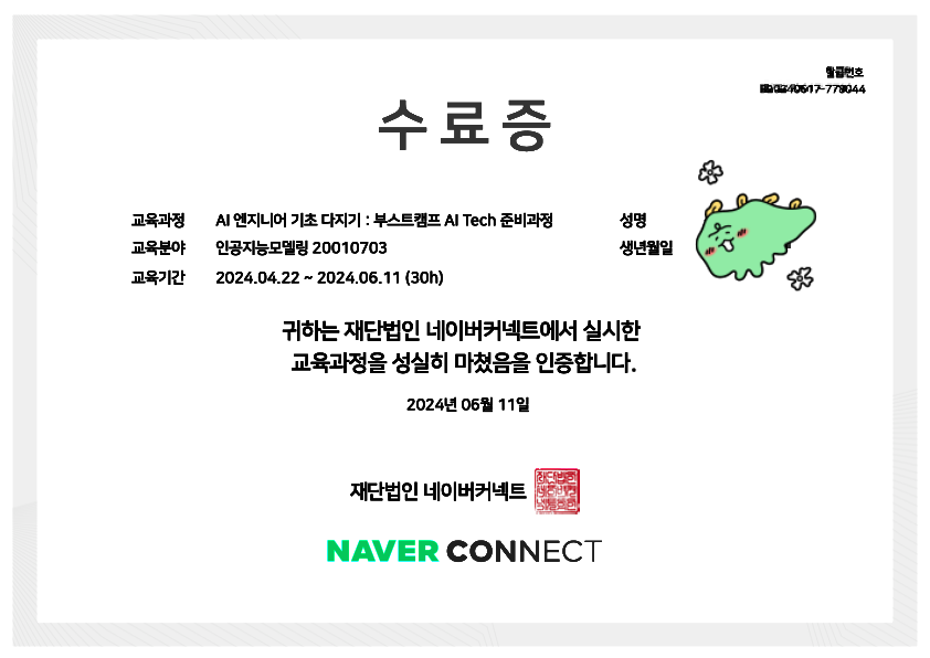 그리고 수료를 하게되면 수료증을 받게되는데 이건 AI Tech 본 과정 지원할 때, 가산점이 있다고 하더라구요?!