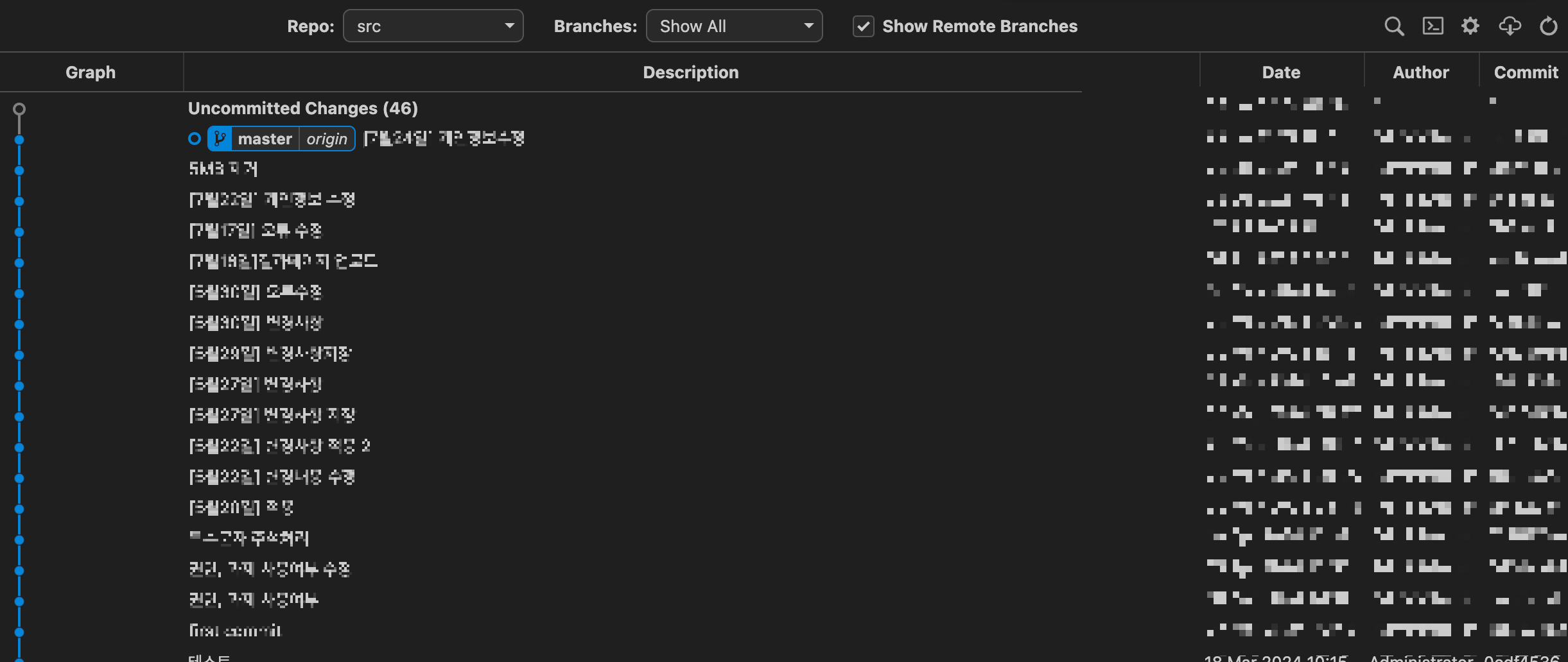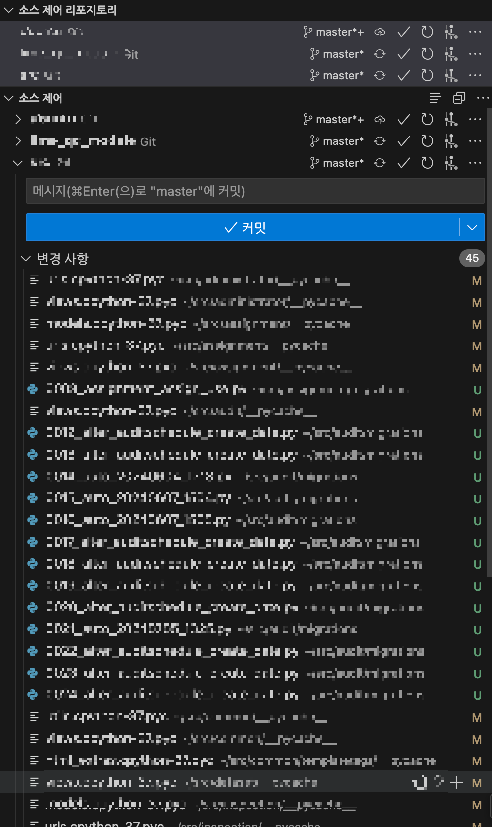 소스제어에서 변경사항 항목들이 쭈욱 리스트 형태로 나열되어있습니다.