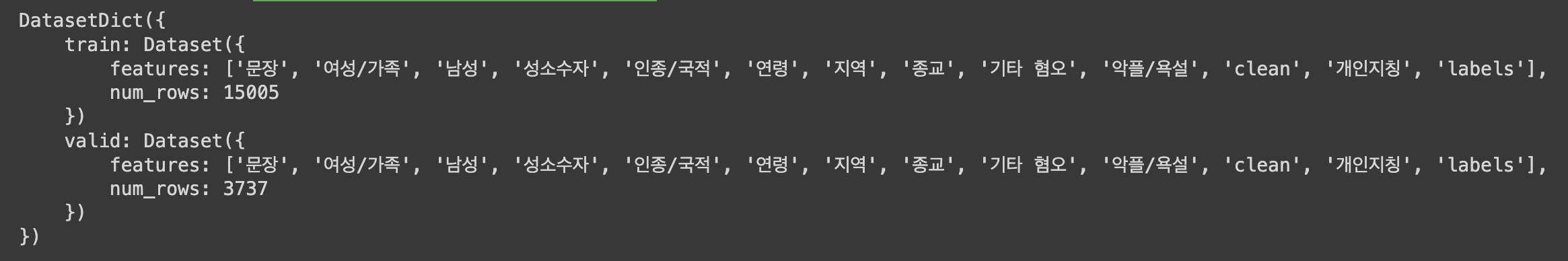 feattures로는 문장, 여성/가족, 남성 등등 욕설에 대한 분류도 나눠져있는 것을 확인할 수 있습니다.