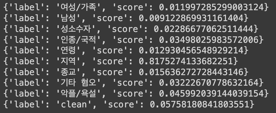 모델에 적용하여 한글 기반의 텍스트의 유해성을 검사하는 방법에 대해서 포스팅해봤습니다.