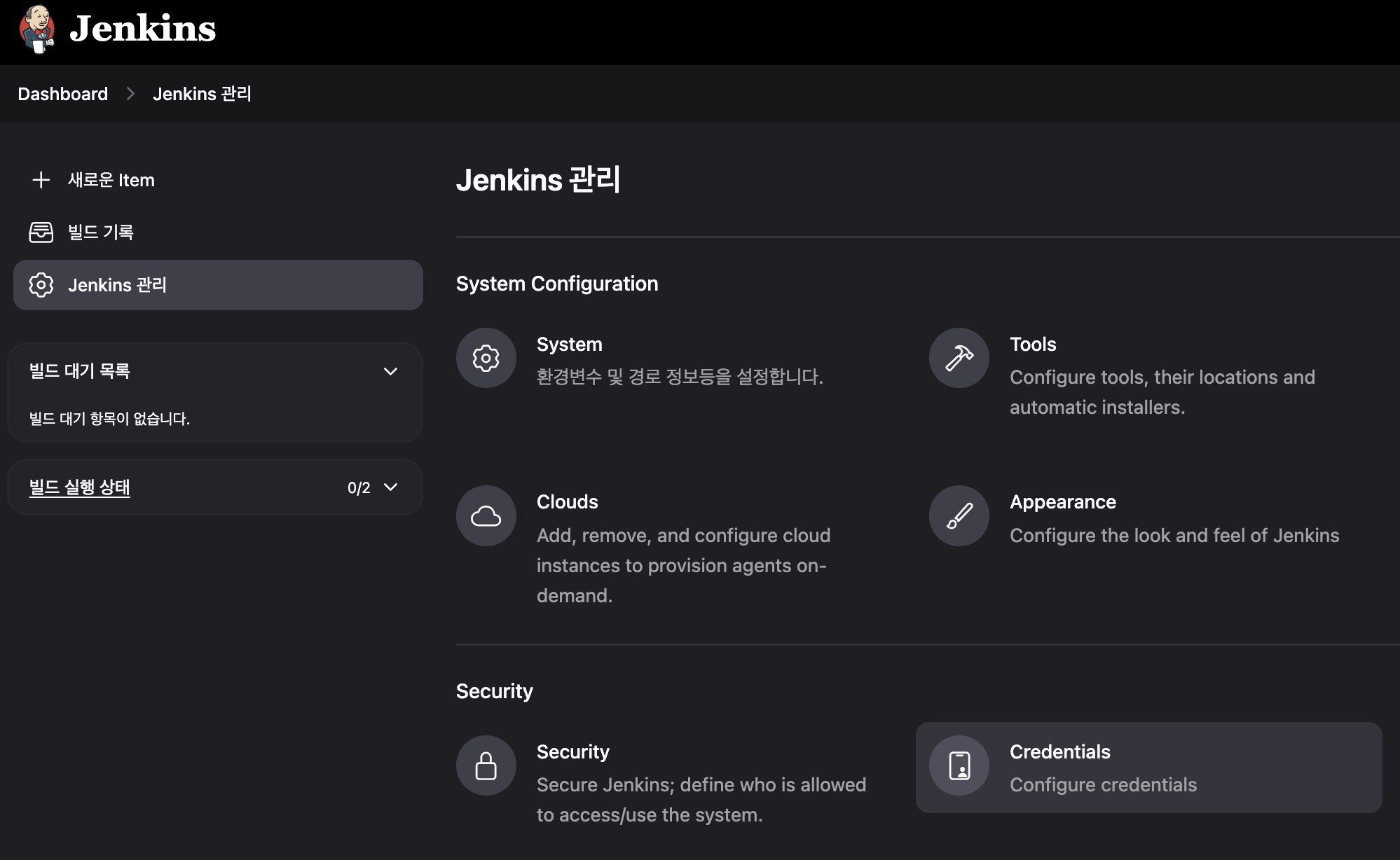 Jenkins mange 메뉴에서 Security의 Credentials를 클릭합니다.