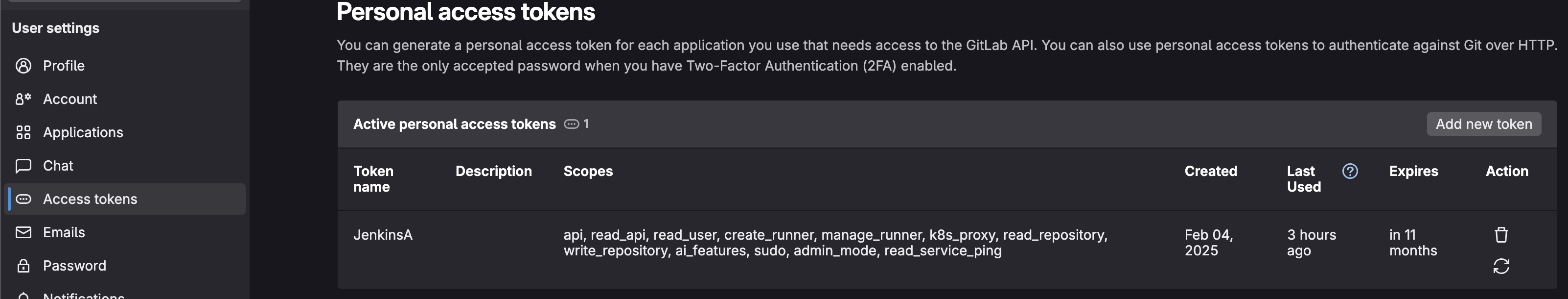 그럼 메뉴에 Acess tokens 항목이 존재합니다.