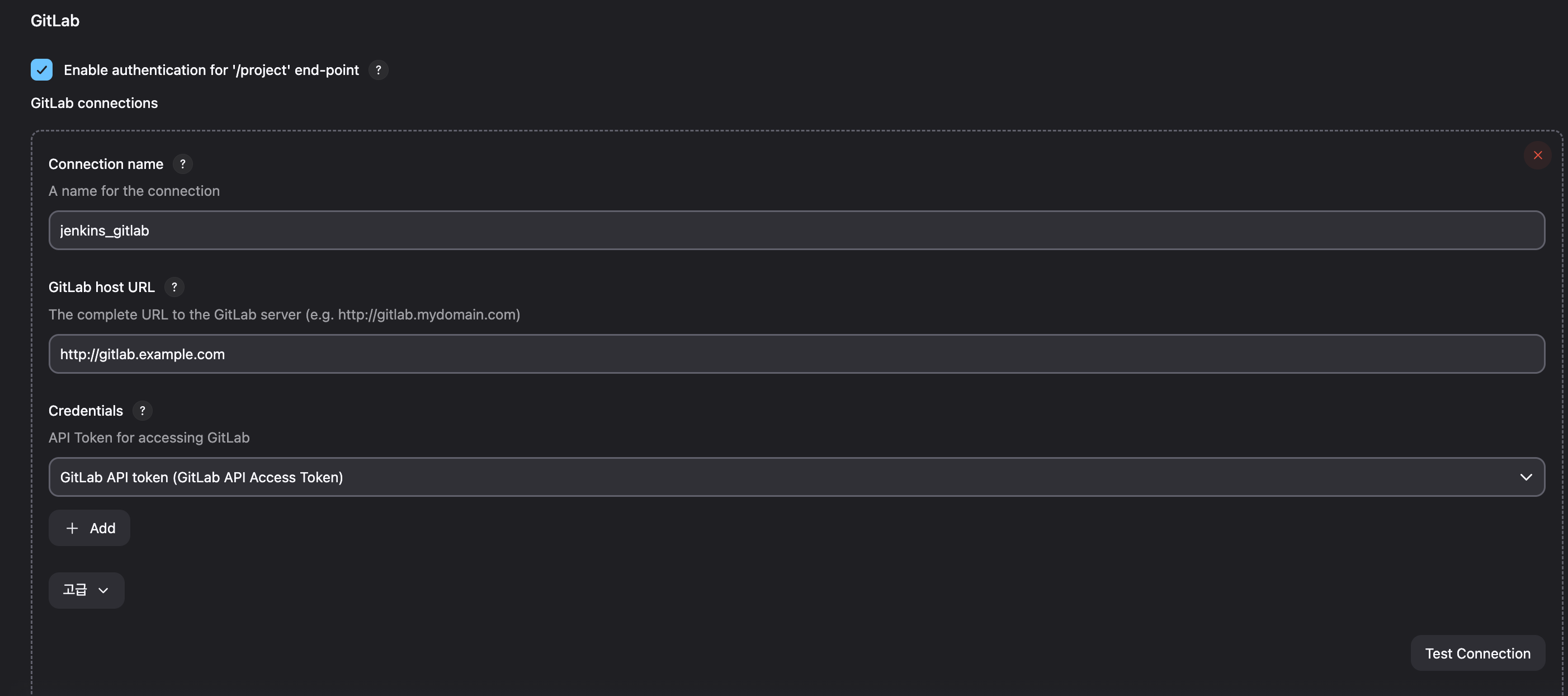 name은 사용자가 사용할 이름, URL은 설정했던 hostname, Credentials은 위에서 생성했던 토큰으로 설정하시면 됩니다.