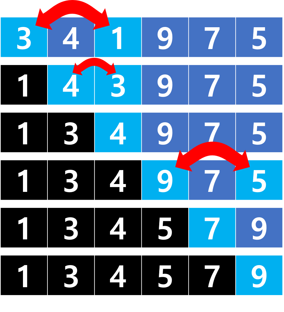 - 그 최소 값과 맨 앞에 위치한 값과 교체한다.