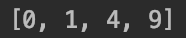 그렇게되면 list(0**2, 1**2, 2**2, 3**2)의 값이 들어가게 되며 **는 제곱 연산자이므로 제곱된 값들이 리스트로 들어가게 됩니다.