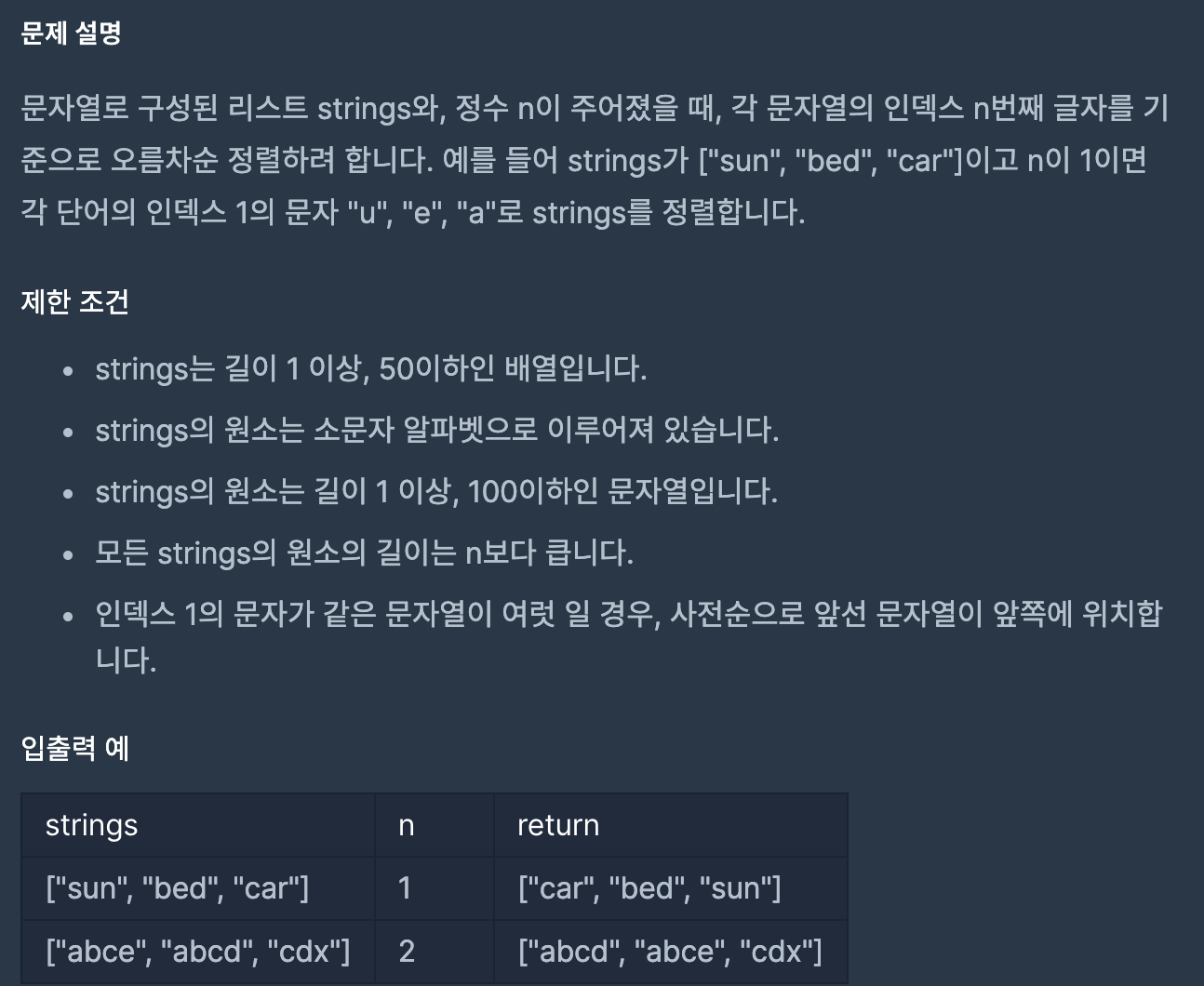 이 예제는 프로그래머스의 문자열 내마음대로 정렬하기 문제로 예를 들어보겠습니다.