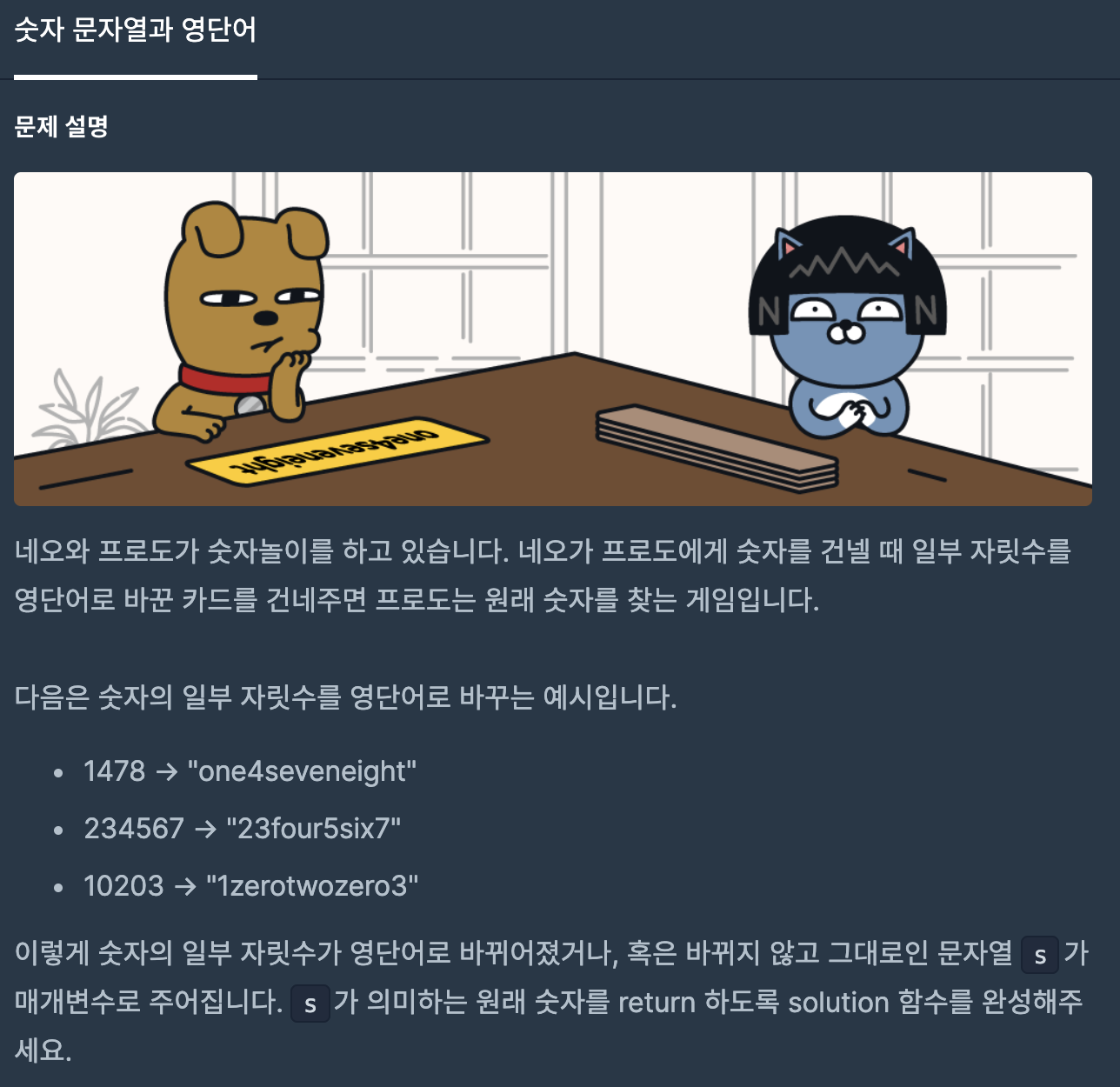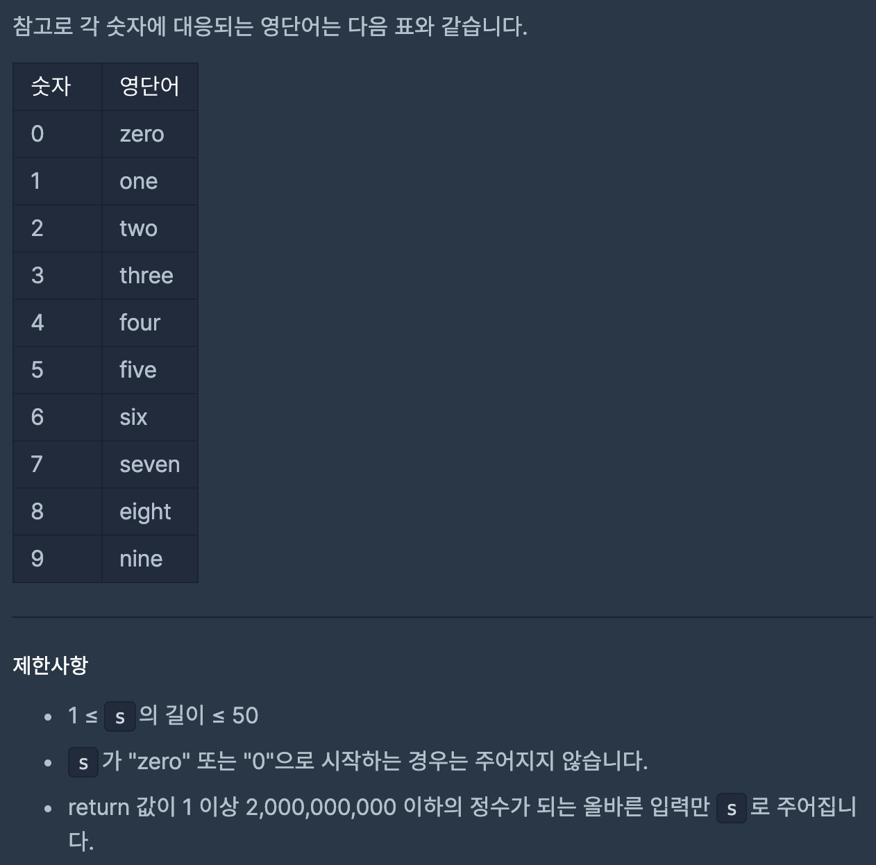 일단 문제는 간단하게 생각하면 문자열을 받고, 해당 문자열에 영단어를 숫자로 변경해서 숫자를 리턴해주면 되는 내용입니다.