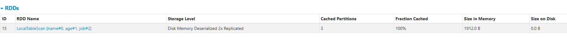 ,InMemoryRelation [name#0, age#1, job#2], StorageLevel(disk, memory, deserialized, 2 replicas)