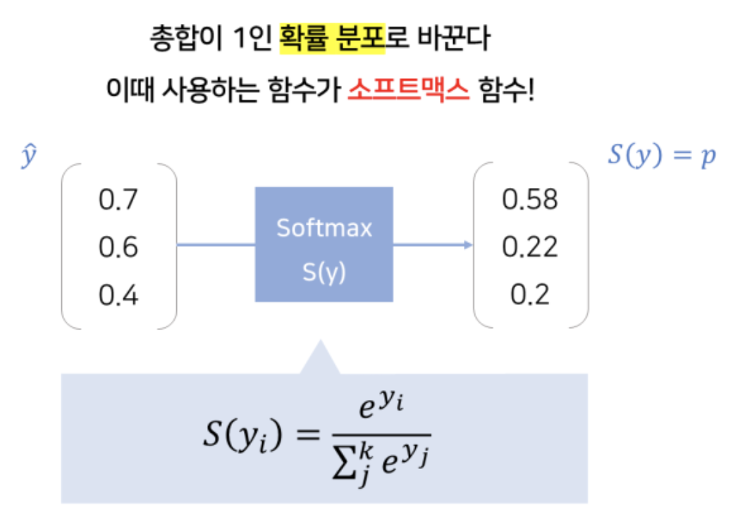 결과 값(logits)을 Softmax함수는 Normalization함수로 결과 값들의 합을 1(확신의 정도)로 변경해줍니다.