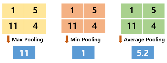 작업에는 대표적으로 Max Pooling, Min Pooling, Average Pooling 3가지 종류가 있습니다.