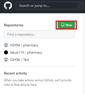 로그인 진행하고 메인화면 왼쪽 상단에 Repositories 옆에 초록색으로 New 버튼을 클릭해주세요.