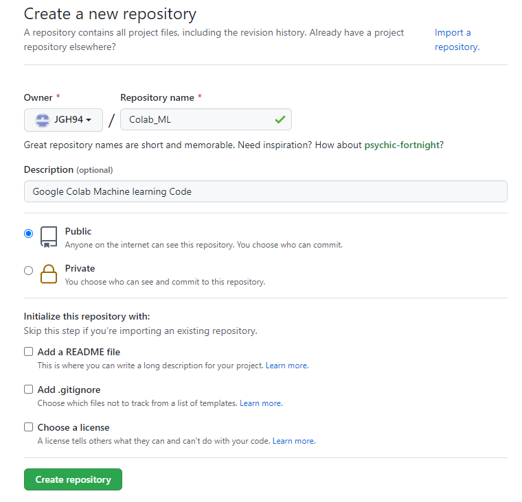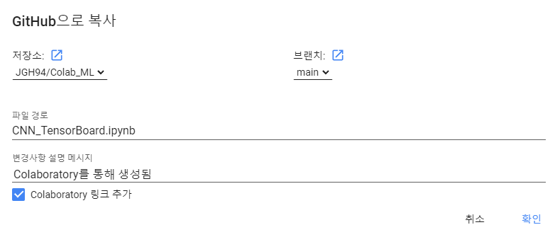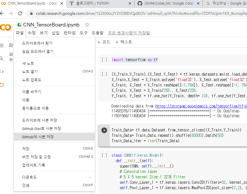 중간에 코랩과 깃허브와 연동을해주고나면 어떤 JGH94의 어느 Repository에 저장할지 설정하고,
