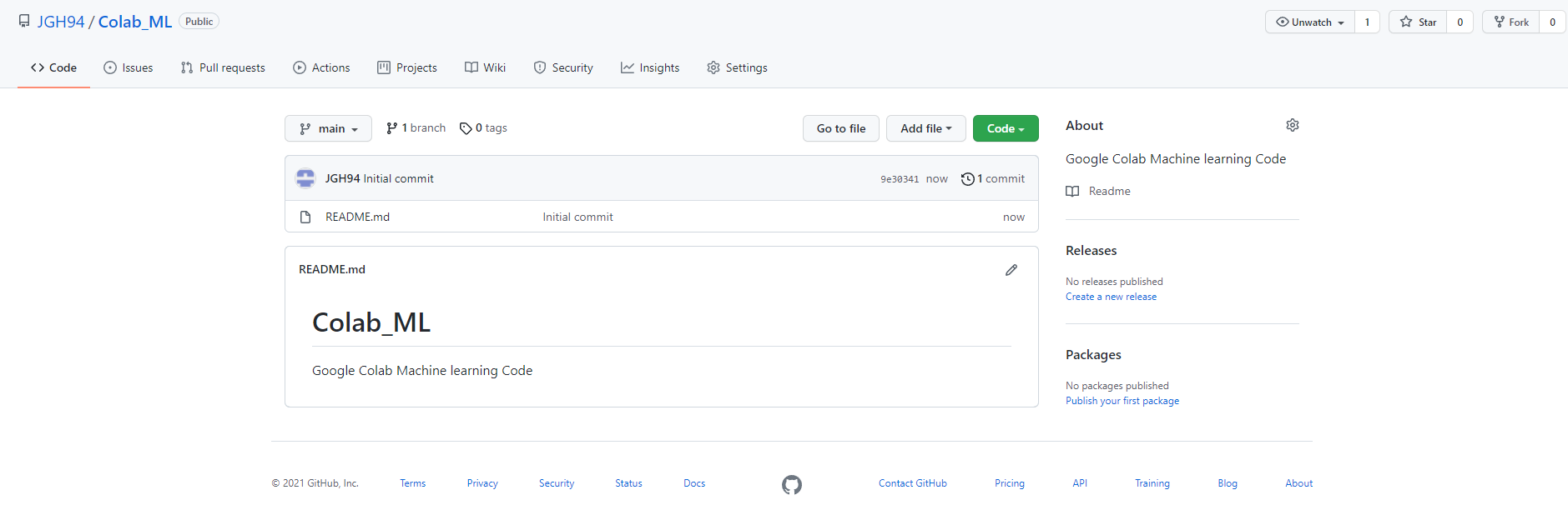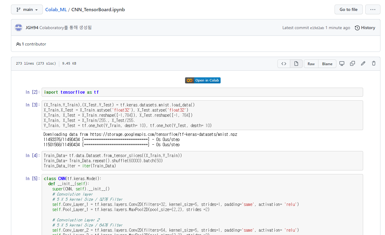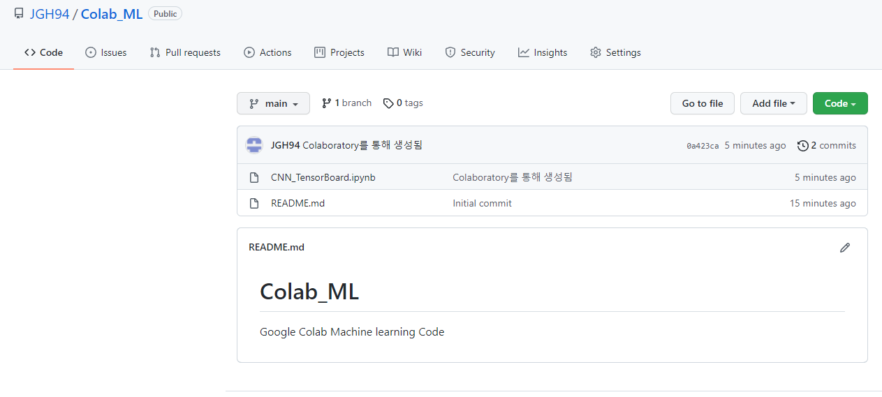 다시 Github로 돌와와보면 해당 Colab_ML Repository안에 저장한 코랩 파일을 확인할 수 있습니다.
